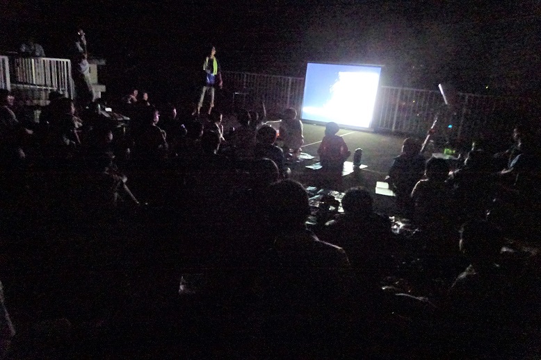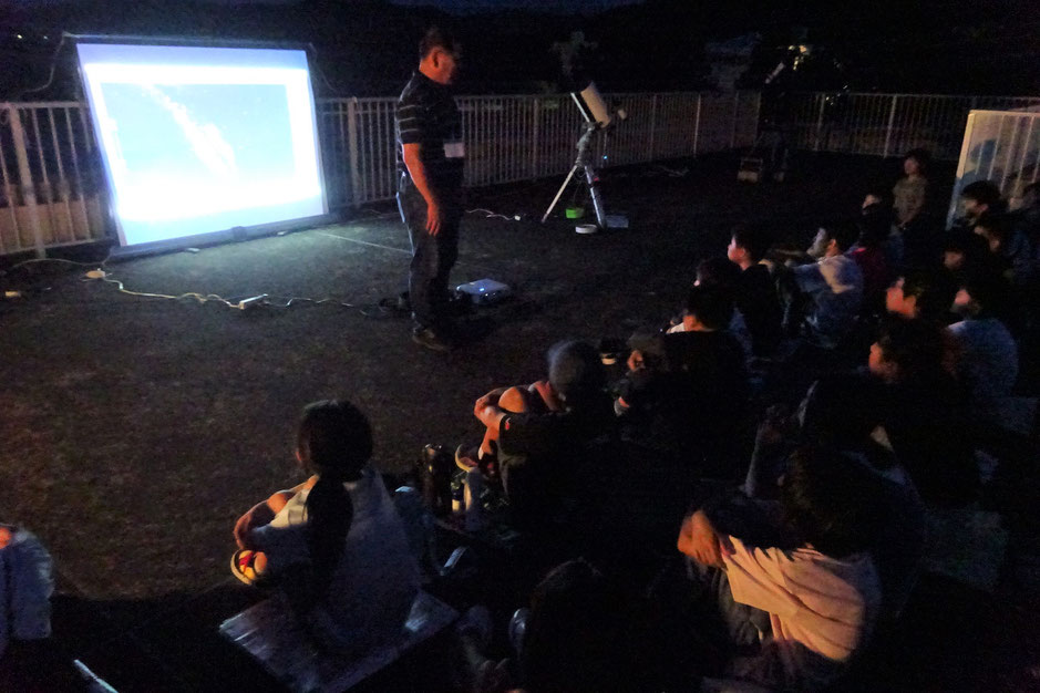 12日(火)、朝には大雨が降りました。これで、もう星空観察は不可能かと諦めかけましたが、夕方には日差しも差し始め、なんとか星空を見上げることができました。これも、参加のみなさんの熱意のおかげでしょうか。