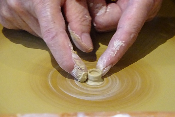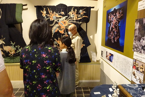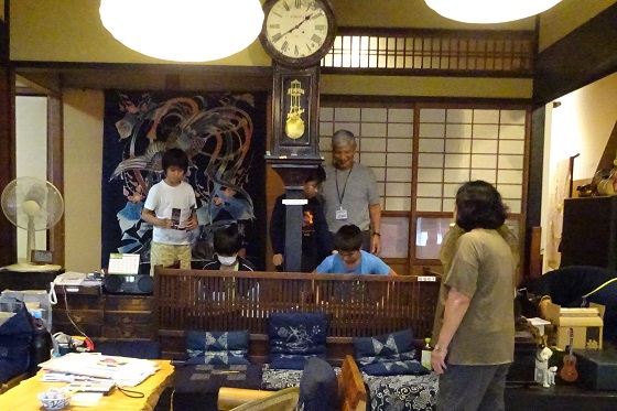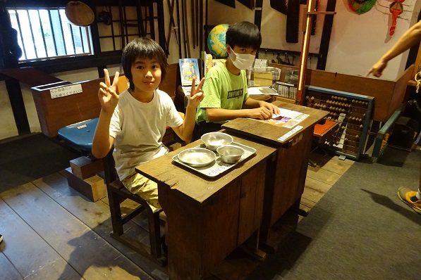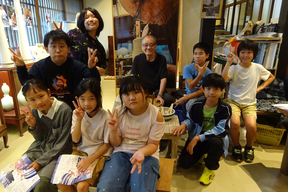 午後からは、砥部むかしのくらし館を訪問しました。ここは梅野精陶所(梅山窯)の商品を扱っていた商家の建物で、砥部焼をはじめ暮らしに関する生活用具を展示してありました。中には、展示品にふれて体験できるコーナーもあり、駕籠をかいたり、二宮金次郎ばりに負子(おいこ)を背負って本を読んでみたり、昔の鏡で自分を映してみたり、江戸・明治時代の帳場に座って番頭のまねをしてみたりしました。めずらしい「夜着(着物の形をした掛布団)」のコレクションもあり、見どころ満載でした。見学が終わった頃にちょうど館長さんであり“現代の名工”として表彰された白潟八洲彦先生が来られて、わざわざ日本一小さいロクロの壺づくりを見せていただきました。その小ささ、見事な手さばきに皆感激です。帰りに一緒に写真を撮っていただきました。