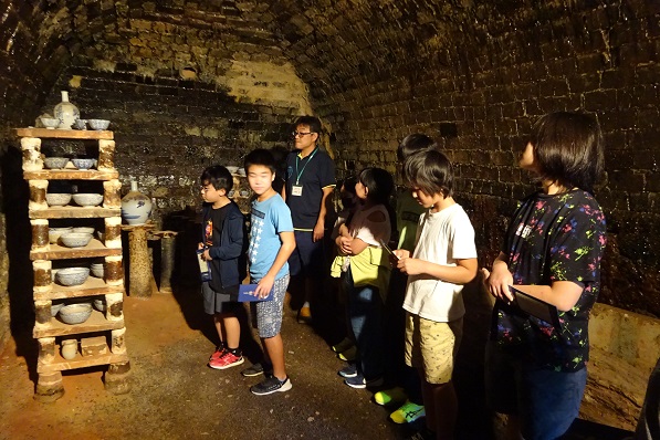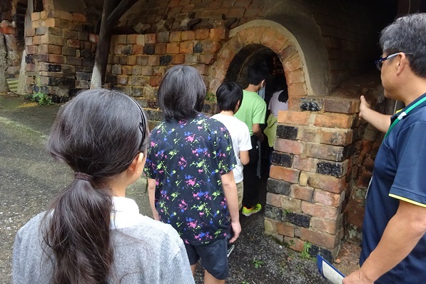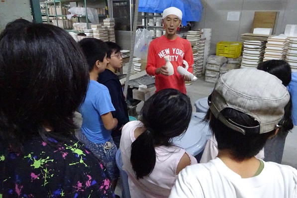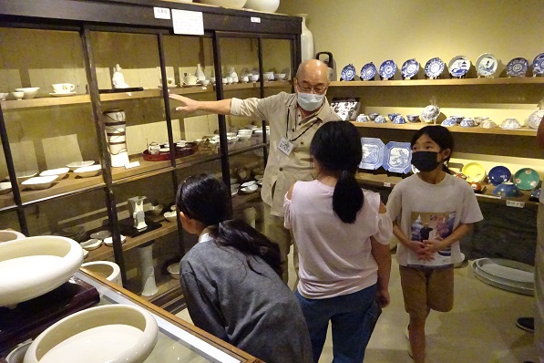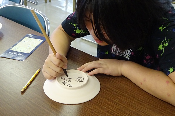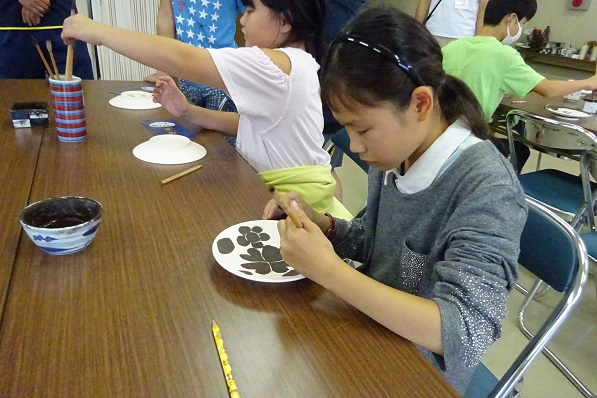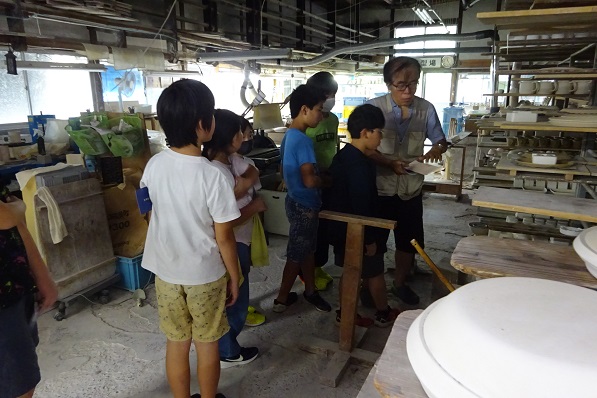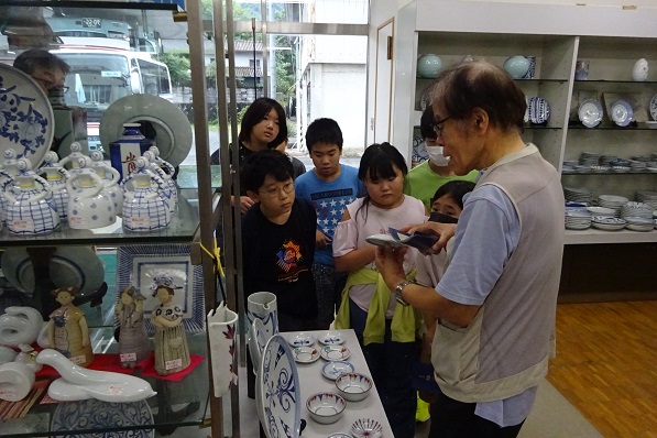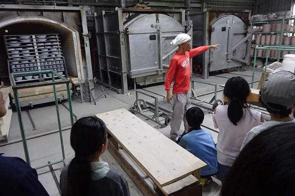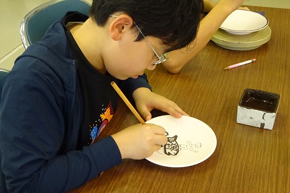まず、窯元としては老舗の梅山窯を訪問しました。最初に日本に現存する最も大きな登り窯を見学し、窯の中に入って窯の仕組みを学びました。続いて梅山古陶資料館で砥部焼の歴史について学び、砥部焼は芸術品を求めるのではなく庶民が生活をするのに使いやすく美しい手作りの品物づくりで個性を表現する方向性で発展してきたことを知りました。いよいよ工場での焼き物づくりの見学です。陶石を粉砕して作った粘土をちょうどよい硬さにして鋳込みや手びねり作業によって成形していく過程と素焼き、絵付け、本焼きなど、多くの作業をたくさんの職人さんが分業で仕事されている様子がよく分かりました。手早く美しく見事なお仕事ぶりに感動です。それを学んだ上で、絵付けを体験しました。思い思いに皿に絵やデザインをつけていきました。青になる1色の呉須を絵筆で描いていくのは難しそうでしたが、子どもたちは集中して味のある見事な画を作っていきました。一人一人、大満足の笑顔が見られました。